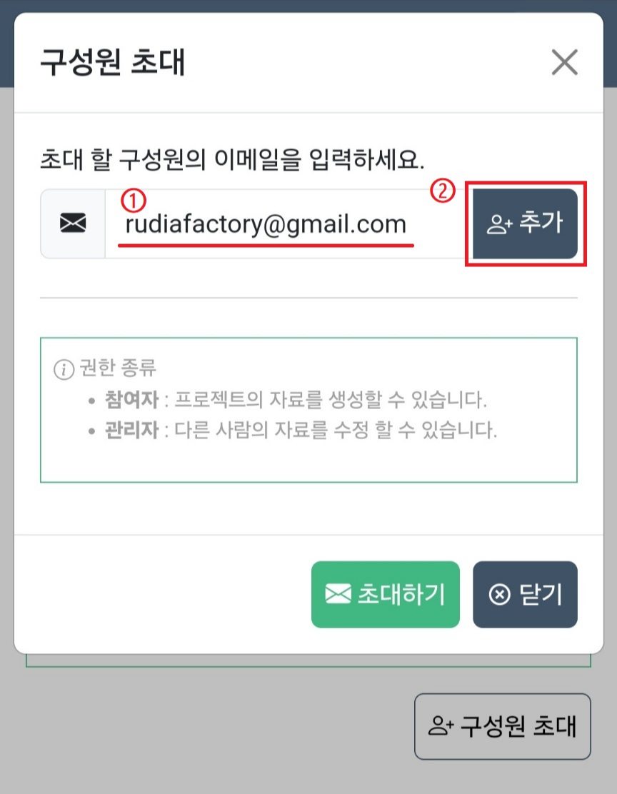 - ① 빈칸에 초대할 구성원의 이메일을 기입합니다.